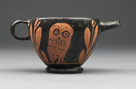 The goddess Athena’s owl on an Attic skyphos (wine cup), second quarter of 5th century BCE. National Gallery of Victoria, Melbourne.