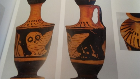 The Athenian owl on a red-figure lekythos (oil container) from Nola, Southern Italy, ca. 4th century BCE. (Staatliche Museen zu Berlin) Antikensammlung, Berlin.