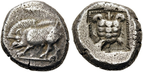 Lycia (in modern-day Turkey) and its boar and tortoise. Silver stater, ca. 490-430 BCE.