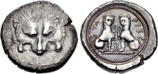 This coin featuring twin panthers or leopards along with a lion on the reverse is also from Lycia. Silver stater, ca. 450-380 BCE. Most figures in ancient art were portrayed in profile, so when they appear with frontal faces as here and as the panther/leopard on the hemiobol, it is thought that they served an apotropaic function, i.e., to ward off evil spirits or bad luck. It could perhaps also be an artistic attempt at breaking with convention.