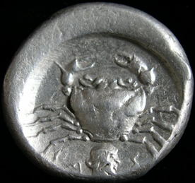 Akragas (modern Agrigento, Sicily) by a crab as on this silver didrachm, ca. 495-478 BCE.