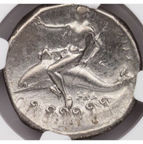 Tarentum (modern Taranto, Calabria) by its eponymous founder Taras riding a dolphin. Silver didrachm, ca. 3rd century BCE.
