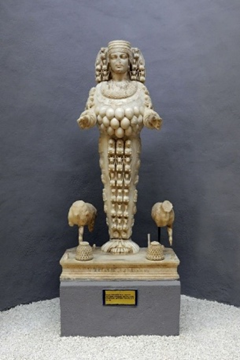 A replica of the cult statue of Ephesian Artemis in the Museum of Ephesus. The earliest temple and statue date back to the Bronze Age although this copy is dated much later. Christians eventually destroyed the temple and statue in the 5th century CE.