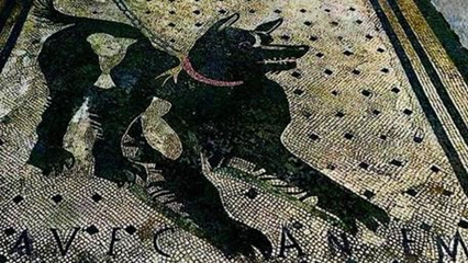 This mosaic from Pompeii depicts a chained guard dog with the inscription Cave Canem (Be aware of the dog), terminus ante quem 79 CE.