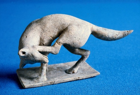 Terracotta figurine of a fox scratching its head. Tanagra, Greece, ca. 5th century BCE. Museum of Fine Arts, Boston.