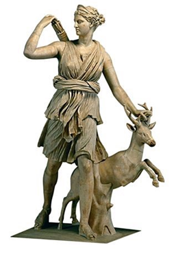 “Artemis and a Stag.” European female (roe) deer may sometimes also sport antlers, so it could be a doe. Roman copy of a sculpture by Greek artist Leochares from ca. 325 BCE. Louvre.