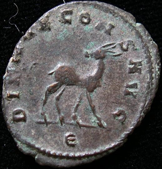 Artemis’/Diana’s deer on a Roman billon Antoninianus, from the reign of Emperor Gallienus, ca. 267/268 CE. DIANAE CONSERVATORI AVGVSTI (to Diana (Artemis), the Preserver of the Emperor).