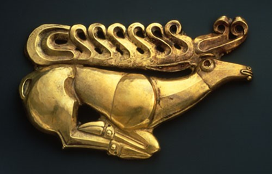 A Scythian fibula (broch) in the shape of a deer. Northern Caucasus. Made of gold, late 7th century BCE. Hermitage, Saint Petersburg.
