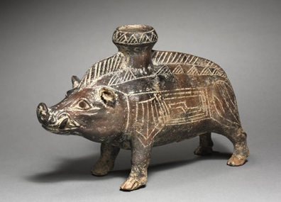 Etruscan perfume bottle in the figure of a boar, ca. 600-500 BCE. Cleveland Museum of Art, Ohio.