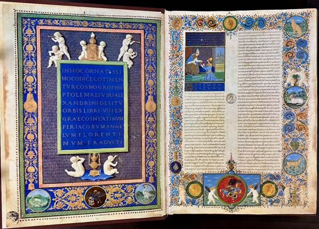 Animals such as a leopard, a dog, a deer, a goose, an eagle, and an ermine are featured in the margins of this renaissance manuscript (Cod. Urb. lat. 277) from 1472 of Ptolemy’s Geography from the 2nd century. Biblioteca Apostolica Vaticana.