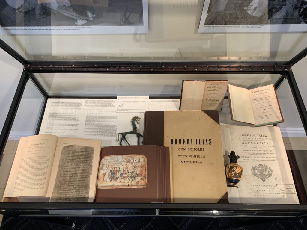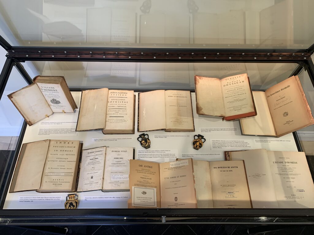 In connection with a CHS conference on November 7, 2025, the library curated an exhibition of Homer scholia and translations. Included were classic translations as those of George Chapman, Alexander Pope, Samuel Butler, T.E. Lawrence (“Lawrence of Arabia”), Richmond Lattimore, and Robert Fagles, and more contemporary ones by Caroline Alexander, Daniel Mendelsohn, Richard Whitaker (South African translation), and Emily Wilson in addition to translations into other languages such as those of Madame Dacier (1647-1720) whose translations of the Iliad and the Odyssey introduced a French audience to Homer. Also included was John Flaxman’s (1755-1826) illustrations of scenes from the Iliad and the Odyssey.