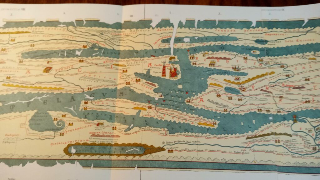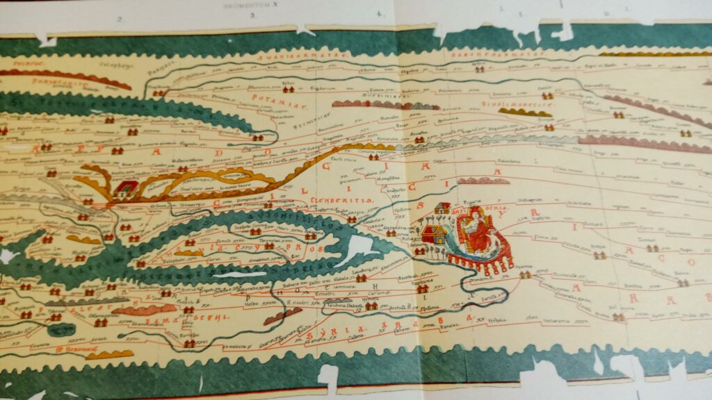 The map consists of a scroll measuring more than 6 meters made up of 11 sections (see image below). Thousands of place names are indicated with Rome, Constantinople, and Antioch receiving special illustrative attention (see below).