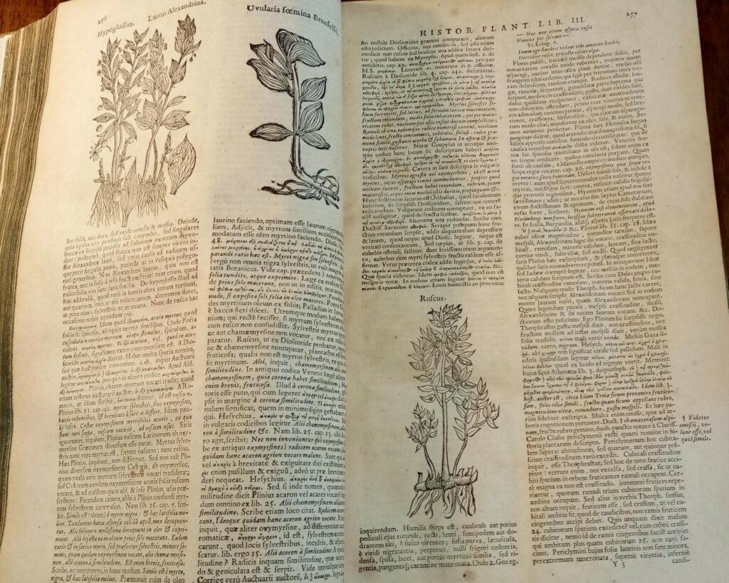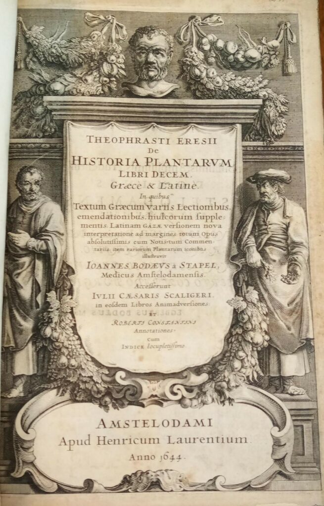 Theophrastus’ Historia Plantarum. Greek text with ample commentary, corrections, and emendations by Daniel Heinsius, Joseph Scaliger, Claudius Salmasius (Claude Saumaise), and Johannes Bodaeus van Stapel, with Latin translation by Theodorus Gaza. Amsterdam 1644. Rare Book and Manuscript Collection, Center for Hellenic Studies.